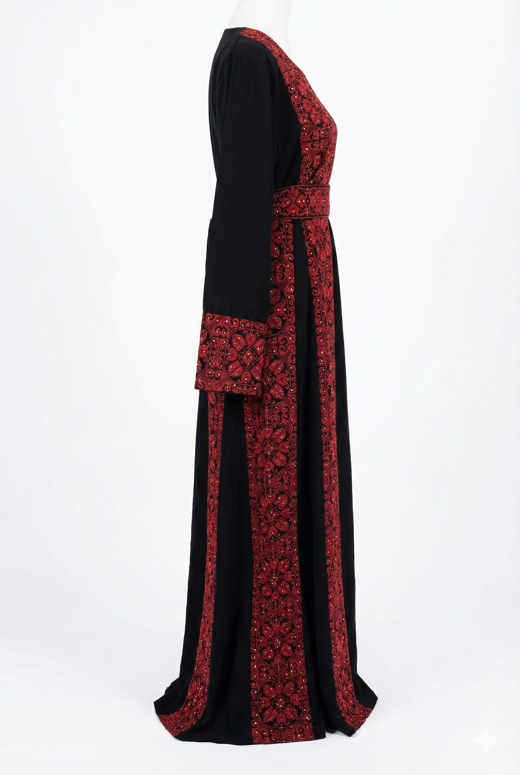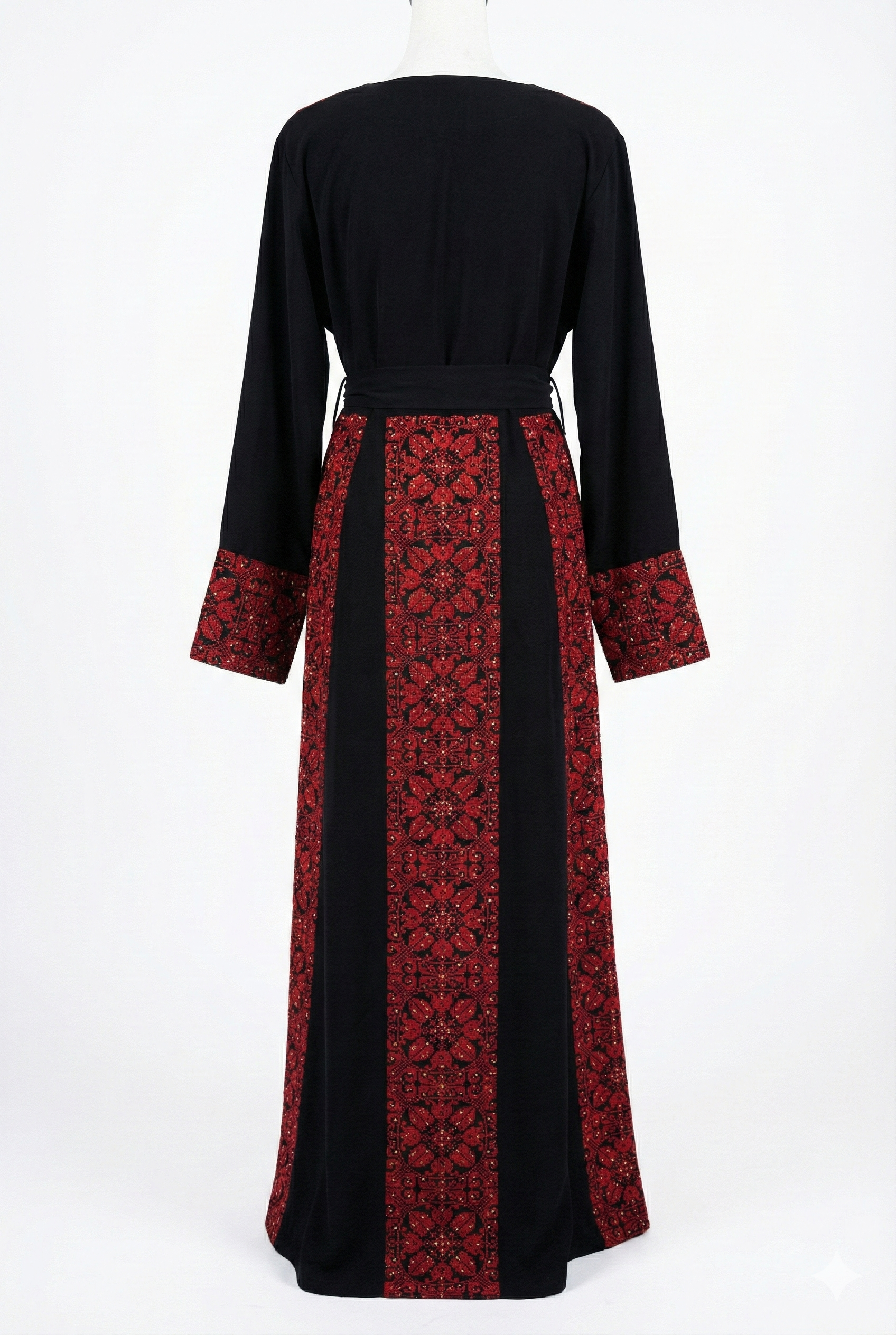 Step into heritage with this exquisite Black and Red Embroidered Thobe, a masterpiece of traditional craftsmanship designed for the modern woman. Featuring intricate "Tatreez" embroidery on both the front and back, this maxi dress showcases a stunning geometric floral motif in deep, vibrant red threads against a luxurious black crepe fabric.