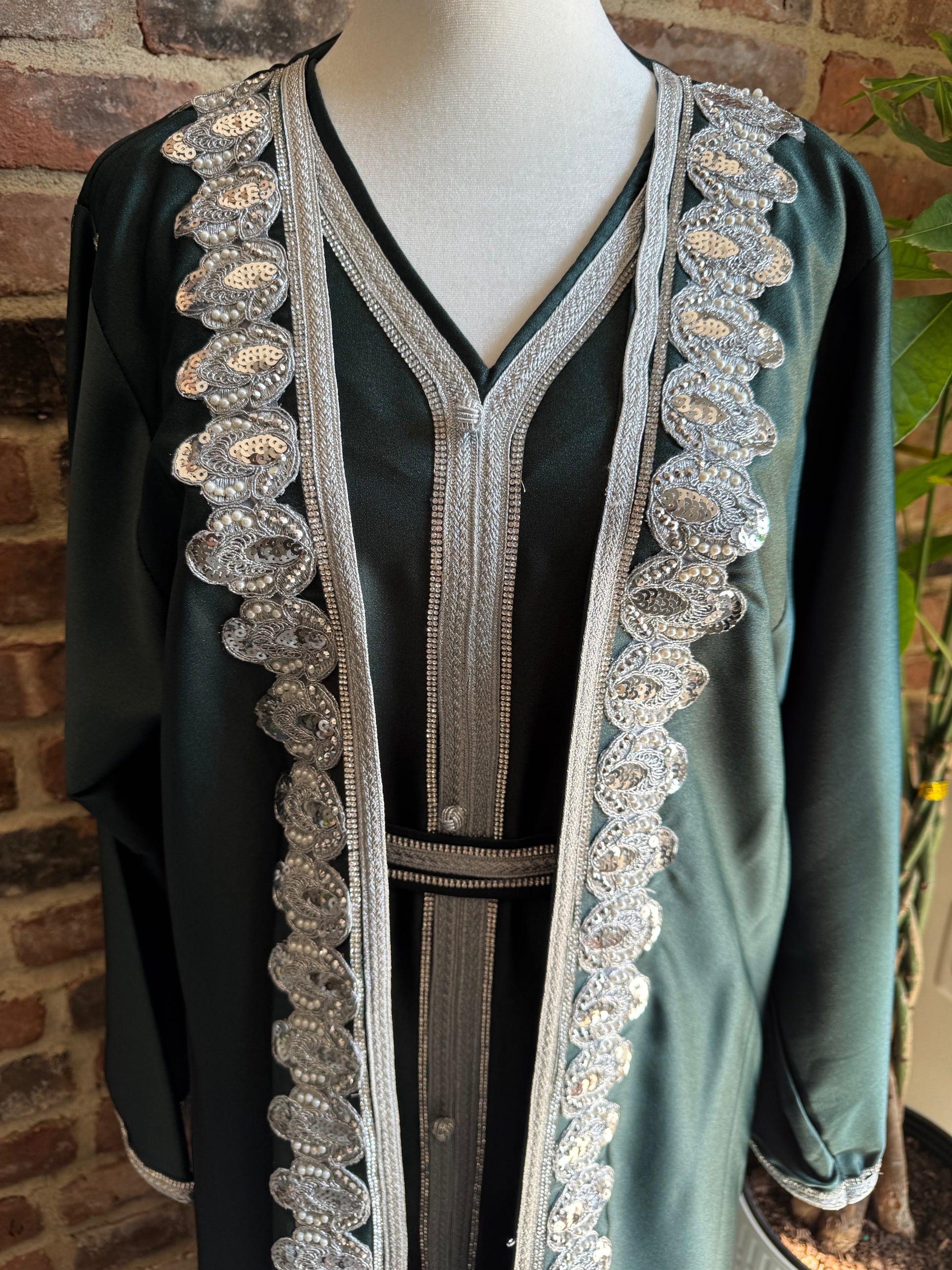 Kaftan Caftan Abaya Wedding Guest Outfit Two Piece Set with Belt - Dark Green