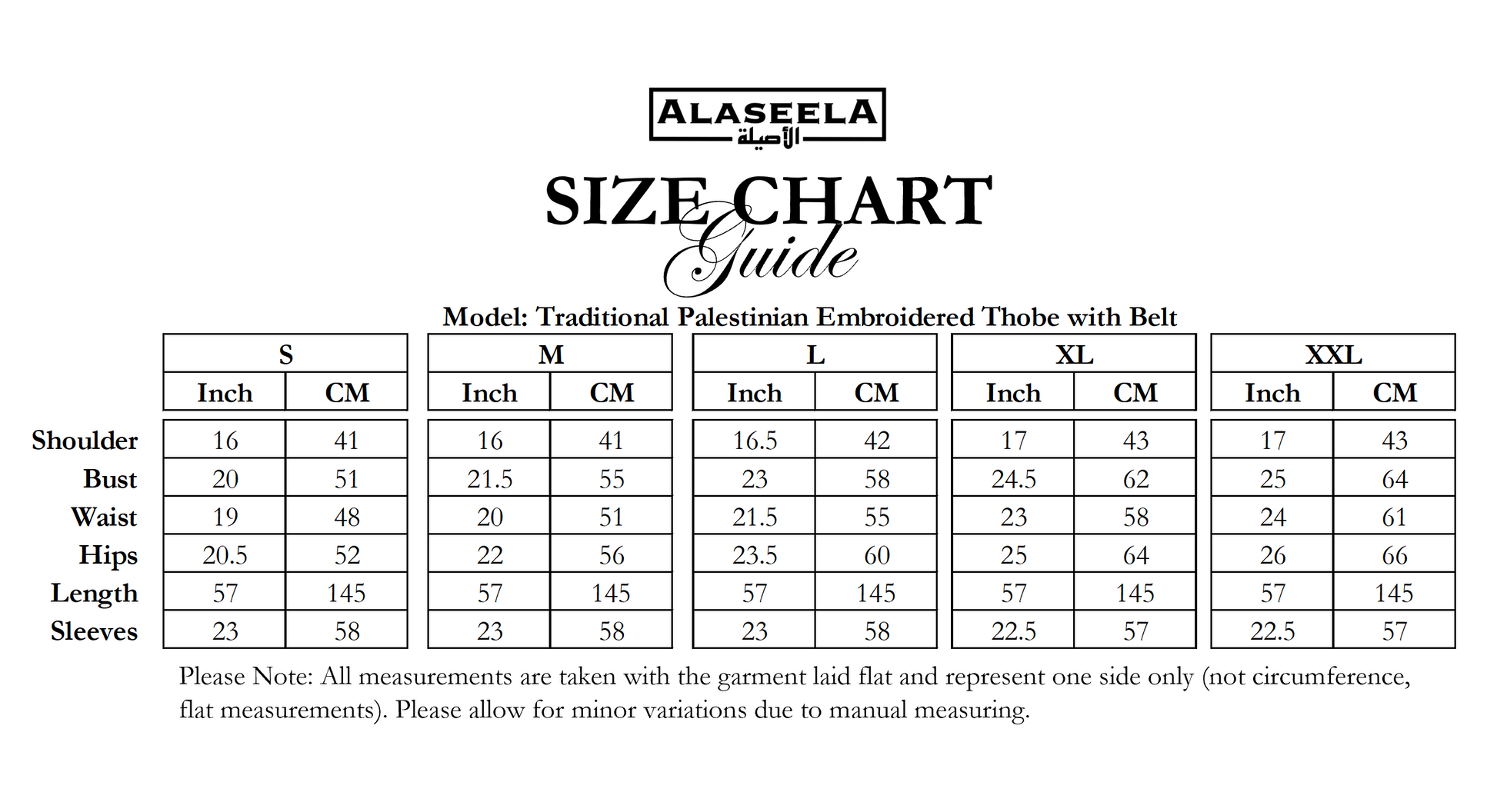 This Traditional Palestinian Embroidered Thobe is available in three colors: Black with Red Embroidery, Black with Blue Embroidery, and White with Red Embroidery. It comes with a belt for styling.